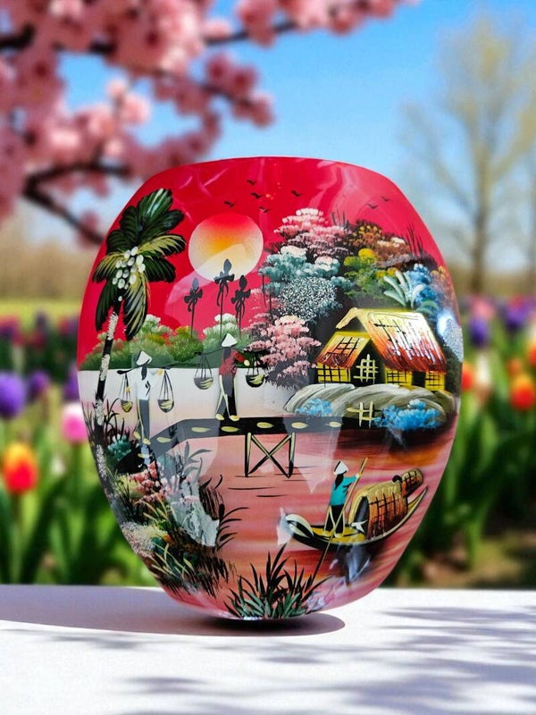 This is a traditional Vietnamese ceramic vase featuring a hand-painted black-and-white countryside scene. The shape is rounded and broad, giving it a strong presence suitable for tabletop or floor display.